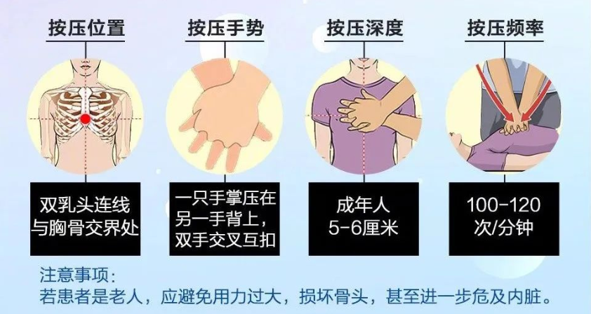 4.心肺復(fù)蘇:包括胸外按壓(C:Compression)、開放氣道(A:Airway)和人工呼吸(B:Breathing)三項(xiàng)技術(shù)。